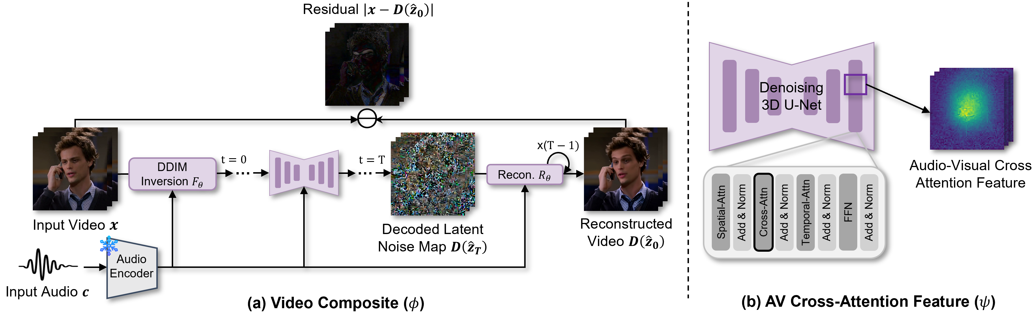 X-AVDT extracts two complementary signals: (i) a video composite capturing inversion-induced discrepancies,