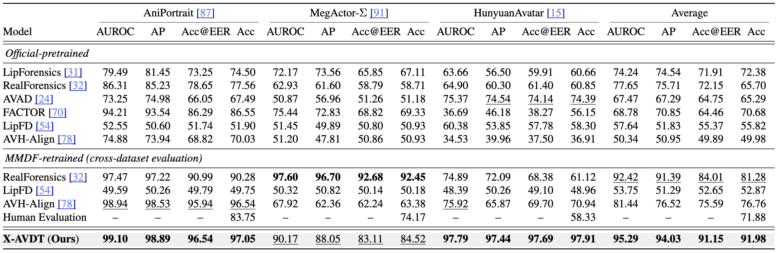 including GANs, diffusion, and flow-matching. Extensive experiments demonstrate that X-AVDT achieves leading